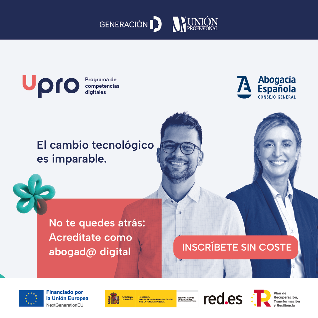Se ha puesto en marcha Upro Programa de competencias digitales, financiado con fondos Next Generation de la Unión Europea que te permitirá formarte sin coste en competencias necesarias para acreditarte como abogad@ digital. / Plazas limitadas