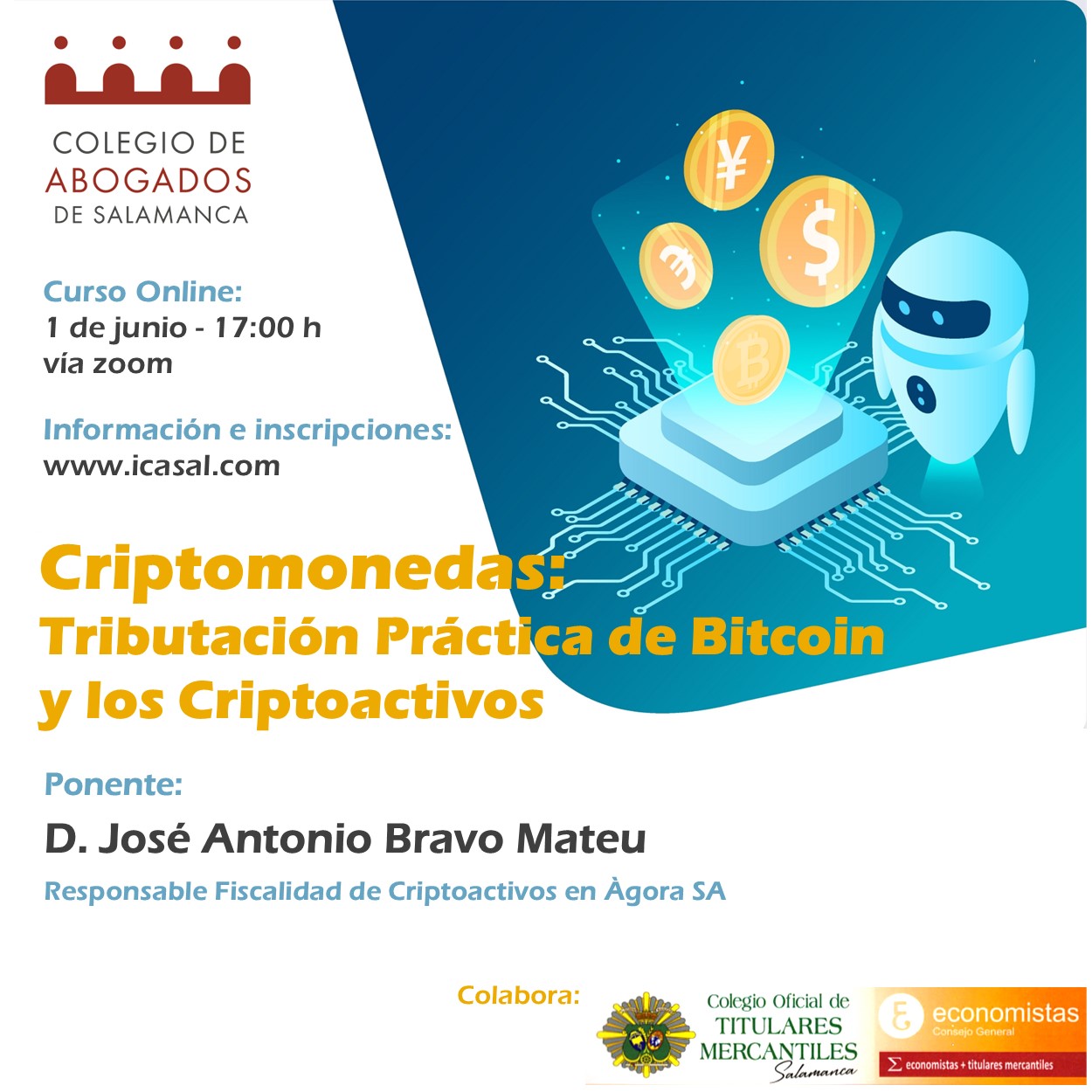 El Colegio de Abogados de Salamanca en colaboración con la Sección de Nuevas Tecnologías y el Colegio de Economistas de Salamanca, hemos organizado el próximo 1 de junio, a las 17:00 h. un Curso Online titulado "Criptomonedas: Tributación práctica de Bitcoin y los Criptoactivos". La ponencia será impartida por José Antonio Bravo Mateu, Experto en Dirección y Gestión de la Información y sus Tecnologías por UAH. Trabaja desde 2013 como asesor tributario y contable bajo la marca Negotians, y desde noviembre de 2021 como responsable de fiscalidad de criptoactivos en Àgora SA bajo la marca Fiscalcrypto.