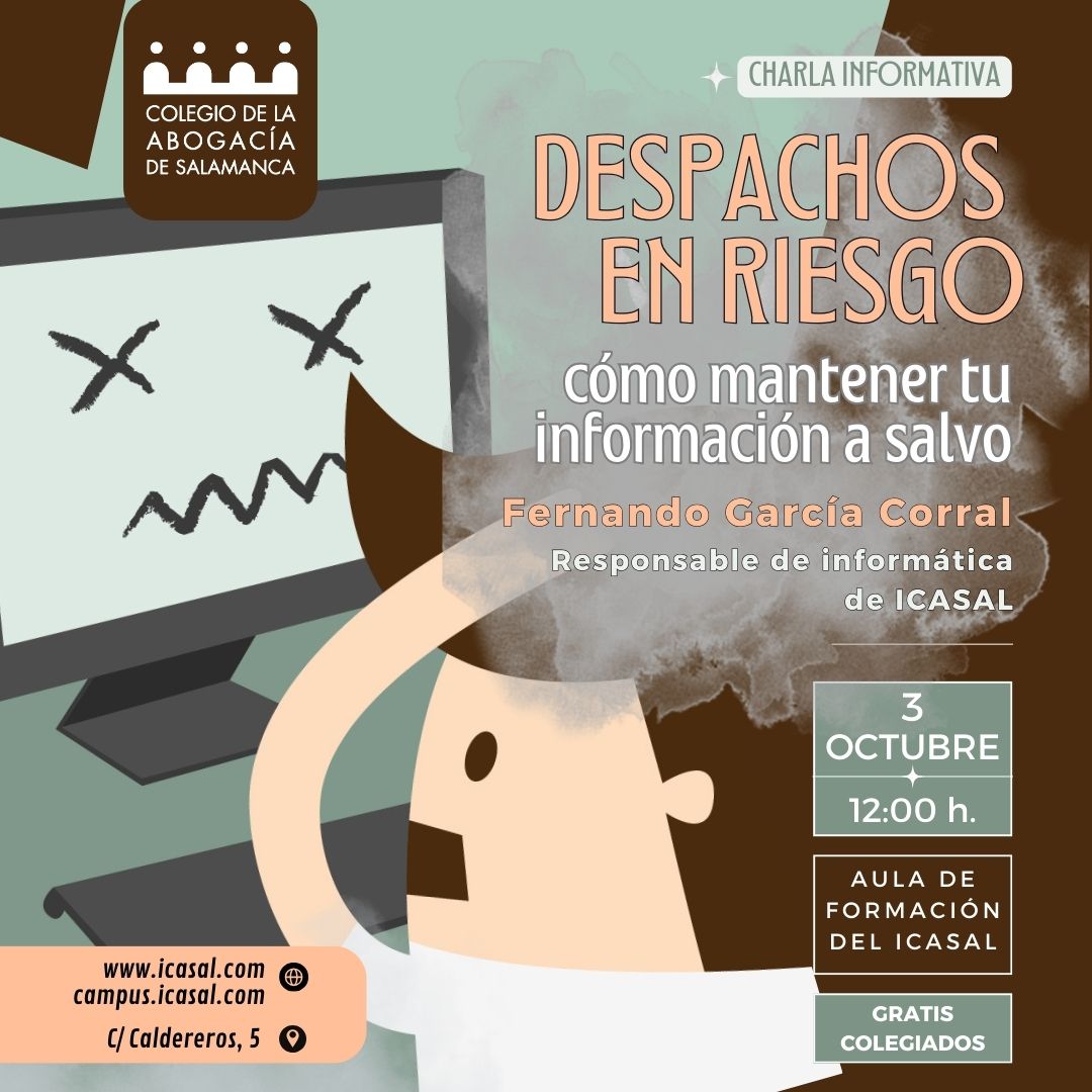 Por ello, os invitamos a la charla informativa: “Despachos en riesgo: cómo mantener tu información a salvo”, impartida por nuestro responsable de informática, Fernando García Corral.