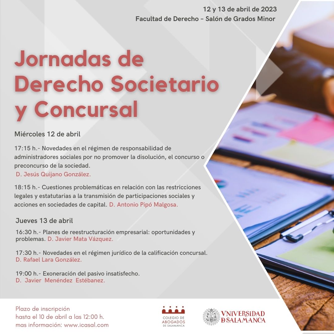 El Colegio, junto con la Facultad de Derecho de la Universidad de Salamanca, hemos organizado unas nuevas jornadas sobre derecho societario y concursal, que contarán con ponentes del máximo nivel a fin de tratar con el mayor rigor los asuntos de actualidad e interés sobre la materia.
