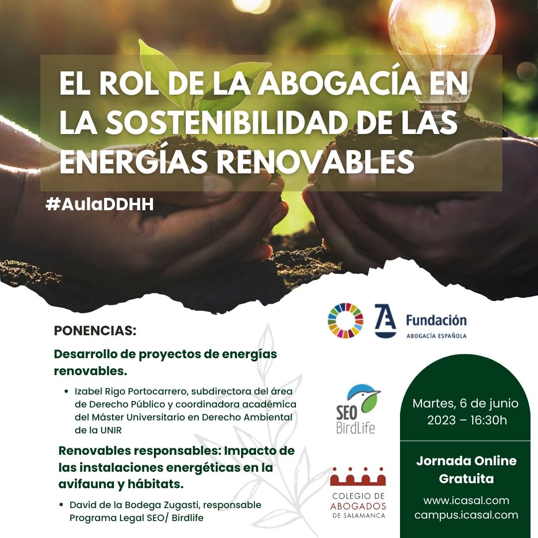 Os esperamos el día 6 de junio a las 16:30 h. una jornada online titulada “El rol de la abogacía en la sostenibilidad de las energías renovables” que contará con dos ponencias: