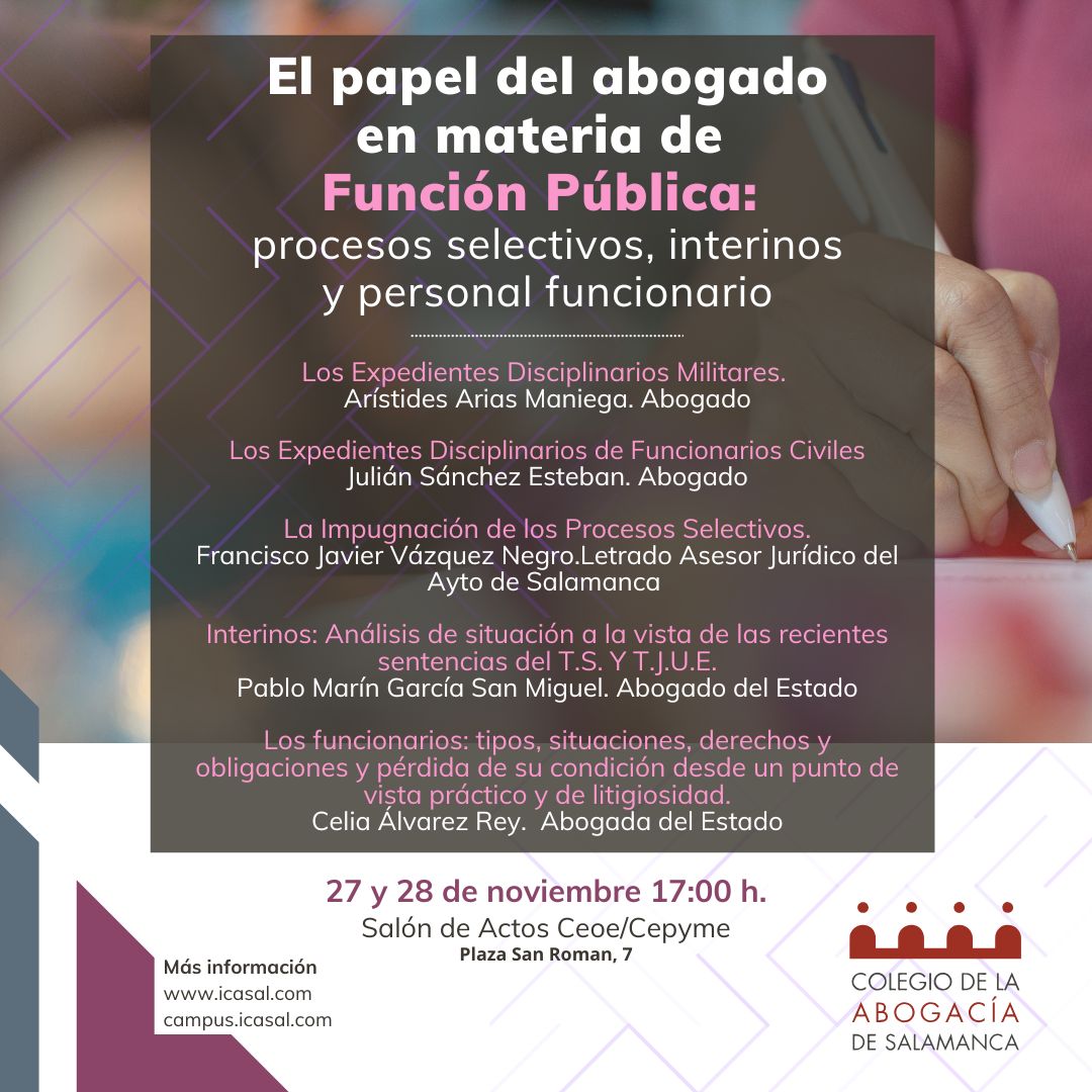 desde el Colegio de la Abogacía de Salamanca hemos organizado un curso sobre Función Pública titulado: “El papel del abogado en materia de función pública: expedientes disciplinarios, procesos selectivos, interinos y personal funcionario”, que celebraremos en el Salón de Actos de CEOE/CEPYME (Plaza San Román, 7), en formato presencial, durante los días 27 y 28 de noviembre, y en sesiones de 17:00 a 20:00 horas cada día.