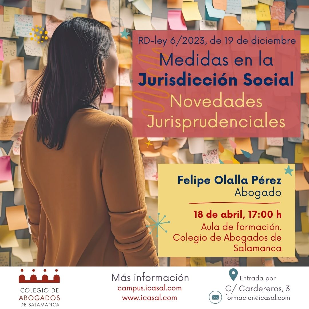 El próximo 18 de abril, hemos organizado desde el Colegio una jornada formativa sobre el "RD-ley 6/2023, de 19 de diciembre. Medidas en la Jurisdicción Social. Novedades jurisprudenciales" con el objetivo de analizar los cambios que ha supuesto la entrada en vigor de este Real Decreto-Ley en materia procesal laboral. Además, repasaremos las novedades jurisprudenciales que han sido noticia en la jurisdicción social en este último año y como se han puesto en práctica en los juzgados de Salamanca. Para ello, contaremos con nuestro compañero, Felipe Olalla que nos aportará, como en otras ocasiones, un enfoque eminentemente práctico.