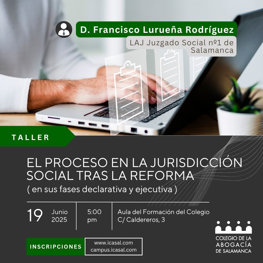 Este taller será una oportunidad para analizar los cambios desde una perspectiva práctica, resolver dudas y compartir experiencias. Será impartido por D. Francisco Lurueña Rodríguez, Letrado de la Administración de Justicia del Juzgado de lo Social nº 1 de Salamanca, moderado por nuestro compañero, D. Maximiano Vallejo Llamas, miembro de la Comisión de Formación y presentado por D. Miguel del Castillo Alonso, Decano del Colegio de la Abogacía de Salamanca.