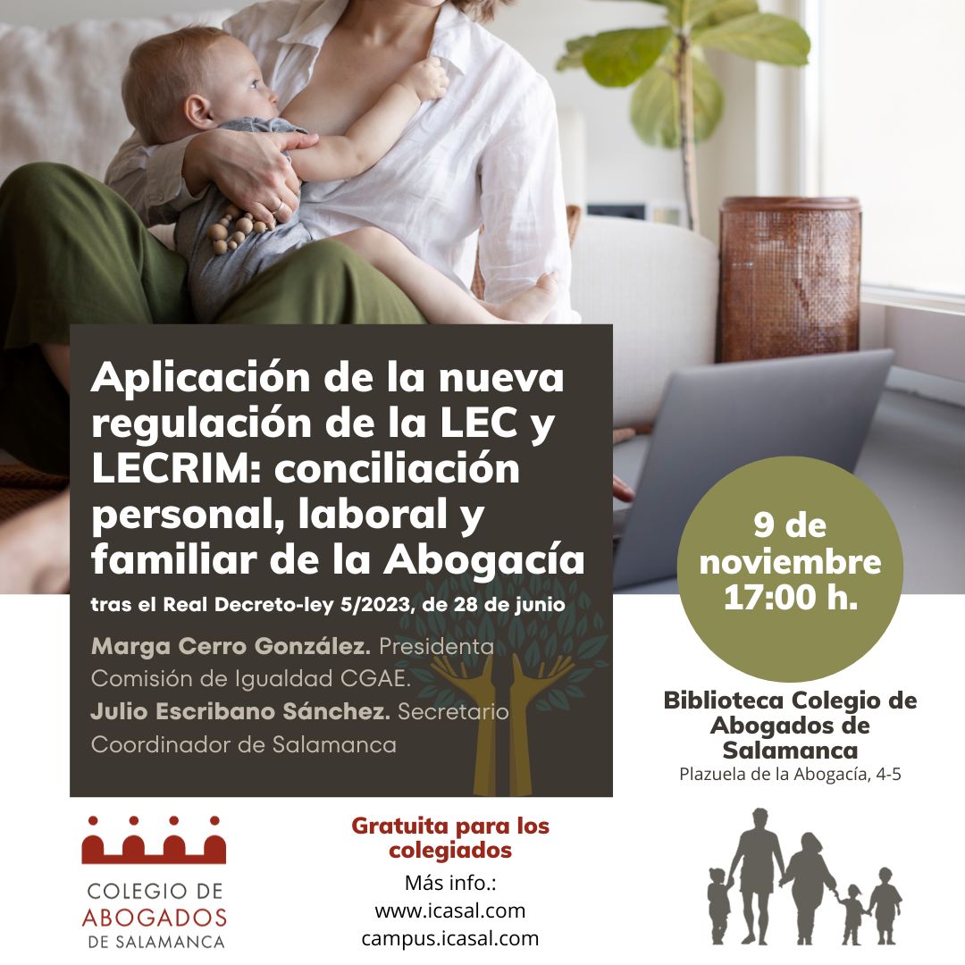 Siendo una necesidad y solicitud histórica de la Abogacía, desde la Comisión de Igualdad junto a la Comisión de Formación y con el fin de resolver todas estas cuestiones y la manera de llevarlo a cabo en la práctica, hemos organizado la jornada «Aplicación de la nueva regulación de la LEC y la LECRIM: conciliación personal, laboral y familiar de la Abogacía», el día 9 de noviembre, a las 17:00 h., en la Biblioteca del Colegio, con dos ponentes de excepción, D. Julio Escribano, Secretario Coordinador Provincial de Salamanca y Dña. Marga Cerro, Presidenta Comisión de Igualdad CGAE