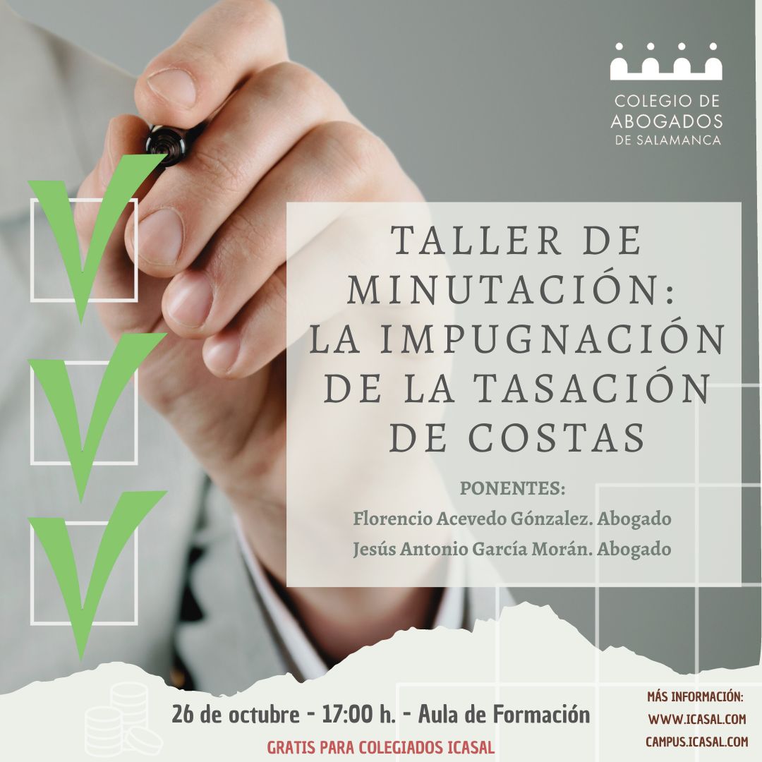 Cuántas veces nos han surgido preguntas del tipo: ¿Cómo se calcula la minuta cuando son varios los Letrados vencedores en costas?, ¿Cómo minutar si el juicio ordinario quedó visto para sentencia en la Audiencia Previa?, ¿Cómo minutar cuando se ejercitan varias acciones?... Para acercarnos a la respuesta a estas preguntas y otras muchas que puedan surgir, el próximo día 26 de octubre, a las 17:00 h. en el Aula de formación del Colegio de Abogados de Salamanca, hemos organizado una jornada formativa muy práctica titulada: “Taller de minutación: la impugnación de la tasación de costas”