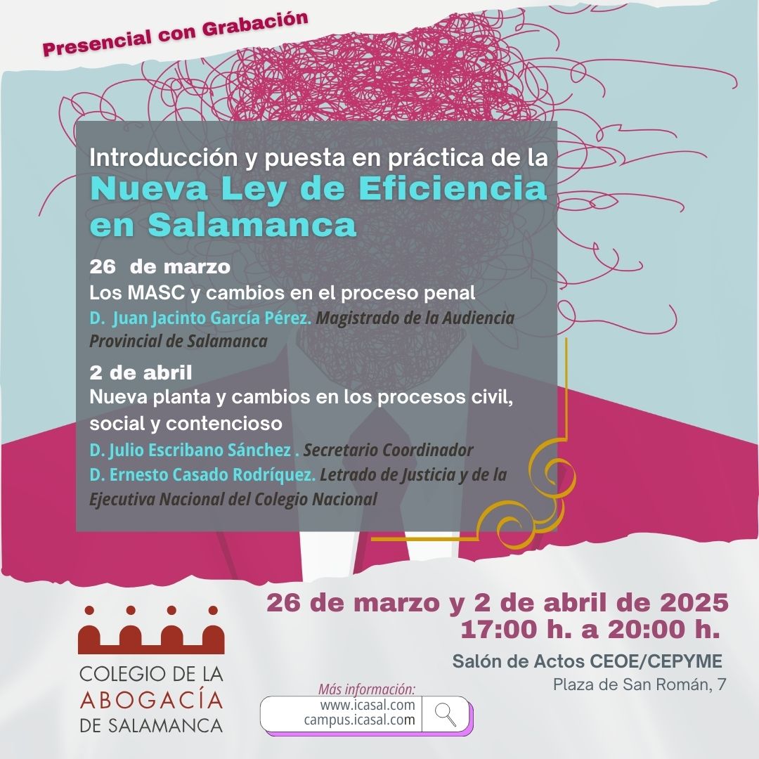 Con el objetivo de informar y preparar a profesionales del ámbito jurídico sobre las importantes reformas introducidas por la Ley Orgánica 1/2025 de Eficiencia del Servicio Público de Justicia, desde la Comisión de formación del Colegio de la Abogacía de Salamanca, hemos organizado un curso presencial con grabación titulado «Puesta en práctica de la nueva Ley de eficiencia en Salamanca» que constará de dos sesiones, en el Salón de Actos de CEOE/CEPYME (Plaza San Román, 7) ,que abordarán las principales novedades en distintas áreas del derecho y la organización judicial en Salamanca.