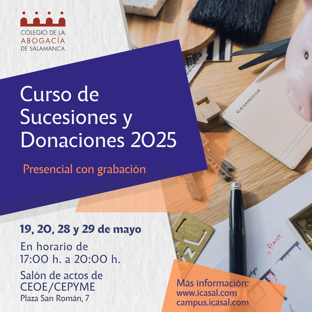 Nos alegra comunicaros que el Colegio de la Abogacía de Salamanca ha organizado una nueva edición del Curso de Especialización en Derecho de Sucesiones, que celebraremos en el Salón de Actos de CEOE/CEPYME (Plaza San Román, 7), en formato presencial con grabación, durante los días 19, 20, 28 y 29 de mayo, y en sesiones de 17:00 h. a 19:30 h. cada día.