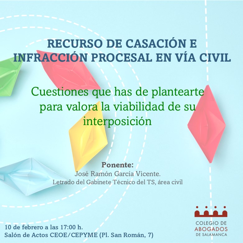 Seminario práctico sobre el “Recurso de Casación e Infracción Procesal en vía civil. Cuestiones que has de plantearte para valorar la viabilidad de su interposición” impartido por D. José Ramón García Vicente. Letrado del Gabinete Técnico del Tribunal Supremo, Área Civil. El seminario será en modalidad única presencial, el día 10 de febrero a las 17:00 h. en el Salón de CEOE-CEPYME (Plaza de San Román, nº 7)