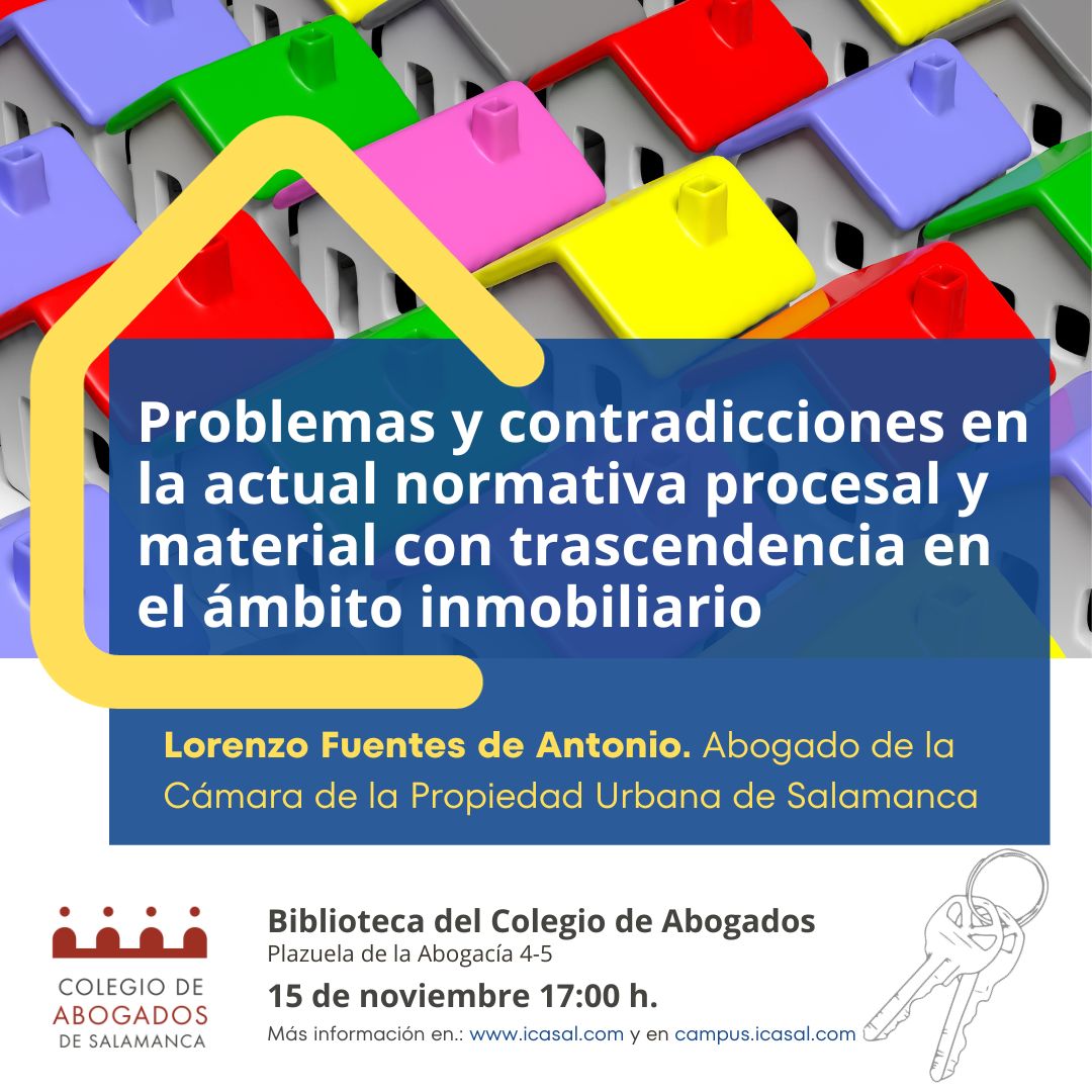 Para tratar de todo ello el Colegio de la Abogacía de Salamanca te invita a apuntarte a la jornada formativa que con el título “Problemas y contradicciones en la actual normativa procesal y material con trascendencia en el ámbito inmobiliario” que será impartida por nuestro compañero Lorenzo Fuentes, abogado de la Cámara de la Propiedad Urbana de Salamanca